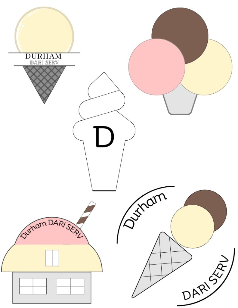 It didn’t start with the logos though. It started with the first ice cream cone I’d eaten at Durham Dari Serv, a local creamery within walking distance of my house. Of course, it was summer then, and I had no need of space heaters to make me crave that particular cooling and refreshing treat. So when the time came for me to choose a local spot to do a project on, this one was at the top of my list, even though it had barely turned spring. It’s a popular spot in the small town I live in, and everyone I talked to had only good things to say about it. I’m not sure branding is really on the owner’s mind here, judging by the sign that hasn’t been changed since the place was opened in the 50s. Of course, it’s well known locally and always has plenty of traffic, both by car and on foot. That didn’t stop me from using it to practice my non-existent branding and logo skills. It almost made it better, the stakes were as non-existent as my experience in the matter.