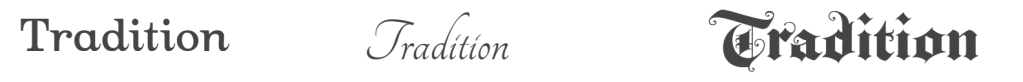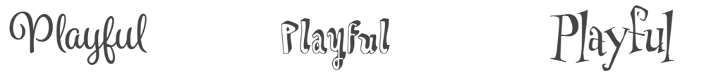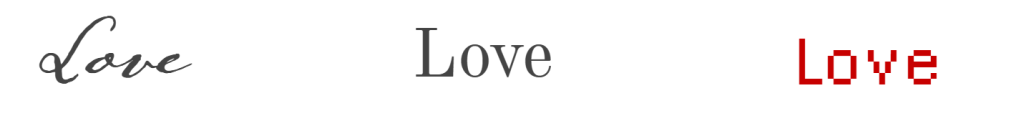 I tried to make sure that each font was different and displayed a different side of the chosen word, or at least had a different feel while still capturing the spirit of it. Love was an interesting one to work with. The three options that made it represented three different “types” of love. The first one was akin to the script in a love letter. Flowy, beautiful, and reminiscent of handwriting. The second one struck me as a sort of “conservative” take on love. Simple and traditional, which ironically, “tradition” also made the cut as one of my chosen words. The third option for love, I tried to go the other way and chose a modern, digital-looking font. I was going for a vibe that fit the kind of purely remote kind of love you might find on a dating site. Some of the words I had less luck being philosophical and was mainly just went with fonts that just “felt right” to me, such as my choices for “playful”.