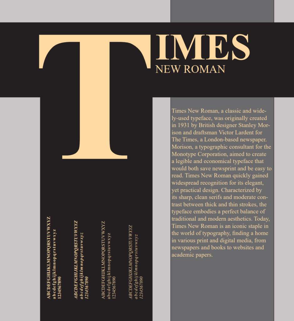 After writing up my own heartfelt eulogy to the rarely used, but never forgotten typeface, I fit it onto a simple poster with clean lines. I tried several variations of the poster with more complexity to them, but I always found the more complex the design the less it felt like Times New Roman to me. In the end, the above image was the result.
