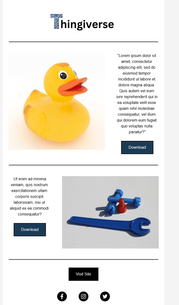 I used mailchimp to actually create the newsletter, and mostly stuck to the drawn design with surprisingly little modification, although I did add some social media symbols at the bottom. In addition to my archetypal toy, I also added a more “practical” example of some 3d prints, in the form of a wrench and some bolts. To be fair these are probably toys themselves, but I felt like it got the point across. To polish it off I made a new logo in Canva and used it as header of the email. Here’s the final result: